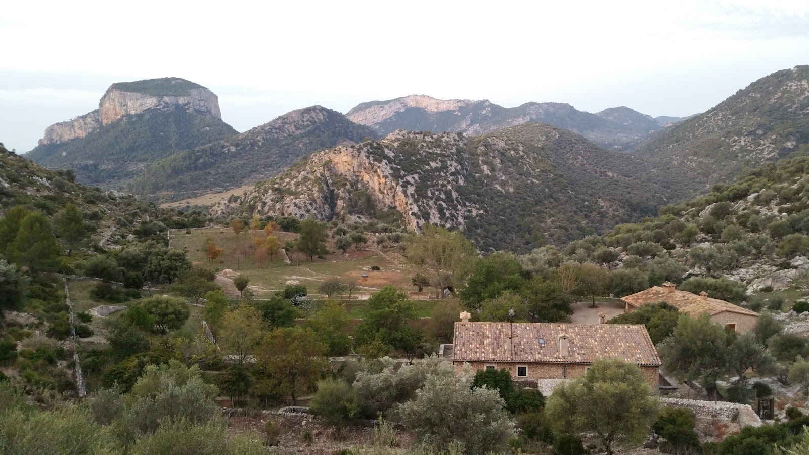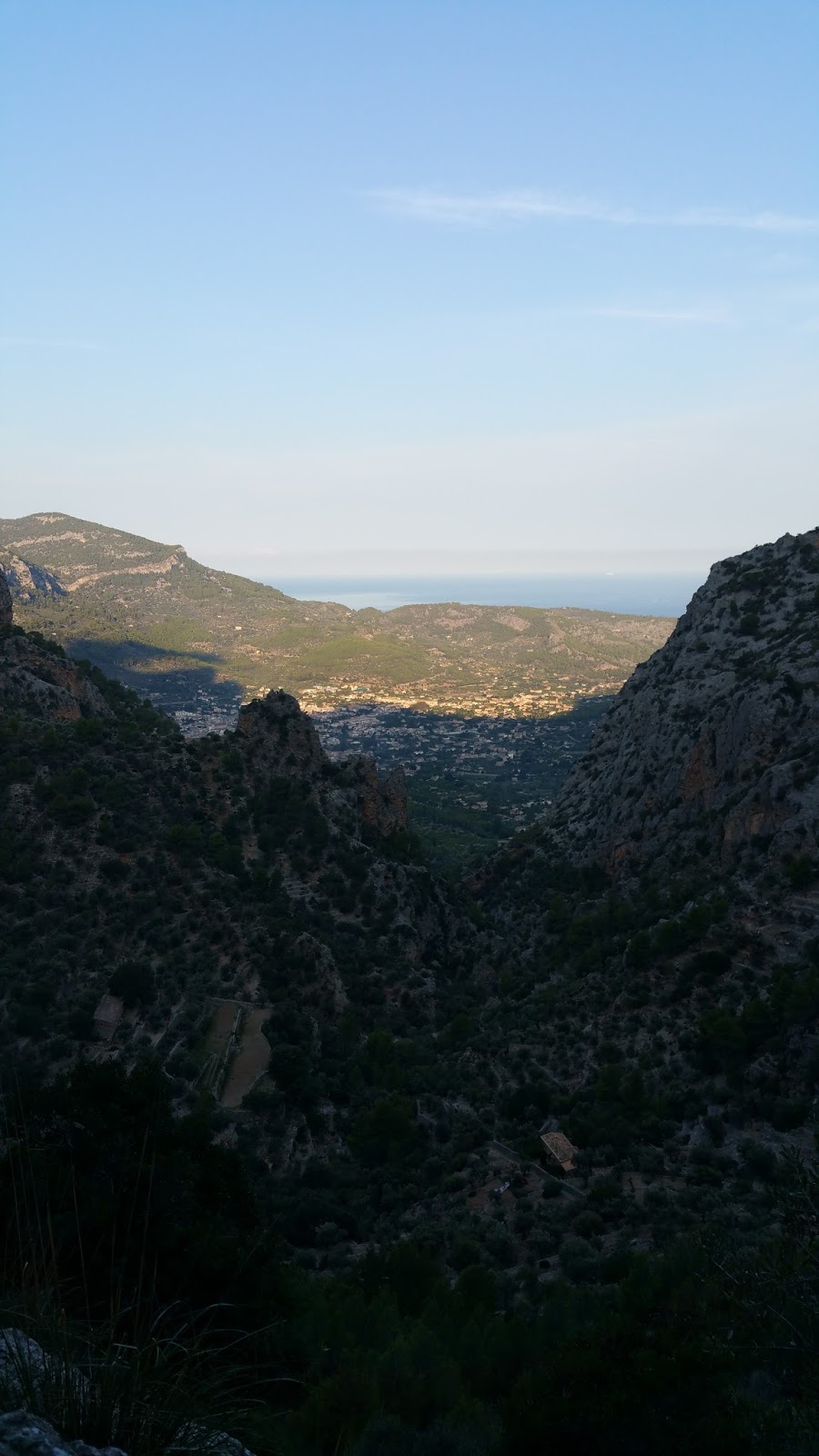 I keep wanting to repeat this for nearly every section on this hike, but this one maybe really was the absolute highlight. After the wonderful meal, no feast, at Ca’n Pintxo the night before, we had another early start. The first few kilometres are more or less flat, a nice warm-up for what’s to come after Biniaraix, mainly along an old pilgrim’s path/route. More than 2000 steps, up and up and up we walk, 750m elevation gain compressed into a little more than 4km. Not a nice as Walsh’s Pyramid in Queensland, but still a good workout. Again, we have the forest, the valley, and the mountain to ourselves. Peaceful and beautiful the path leads steadily up through a constantly narrowing valley, all of a sudden there are some fincas and olive groves sprinkled across the landscape before we climb further up into the steep massif. Looking back is fantastic, the early morning light illuminates Soller and the ocean in the background, the dark rocks loom in front of us and we eat a ton of stuff from the best pasteleria in Soller for late breakfast. 🙂