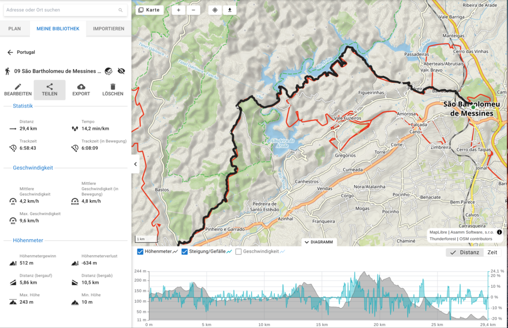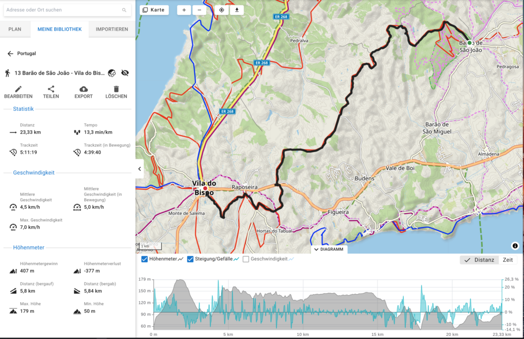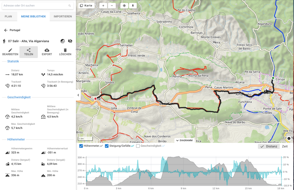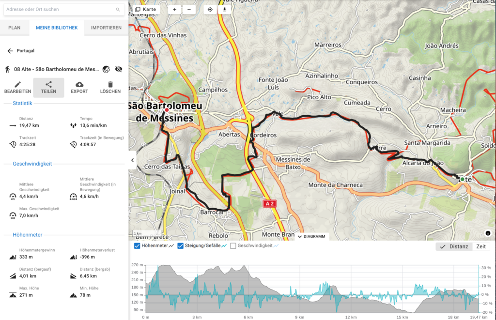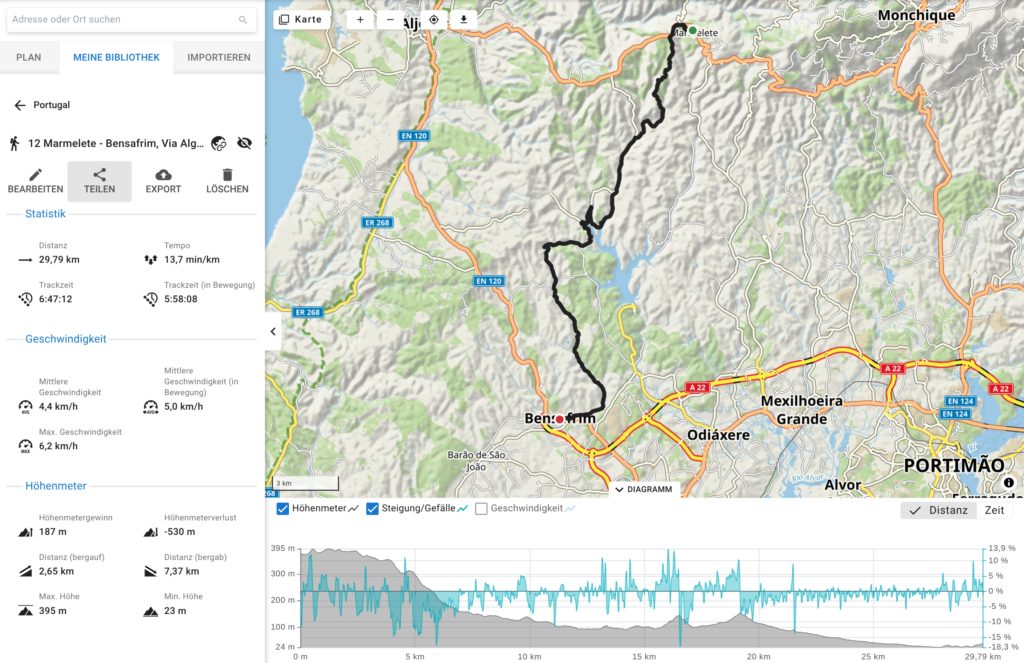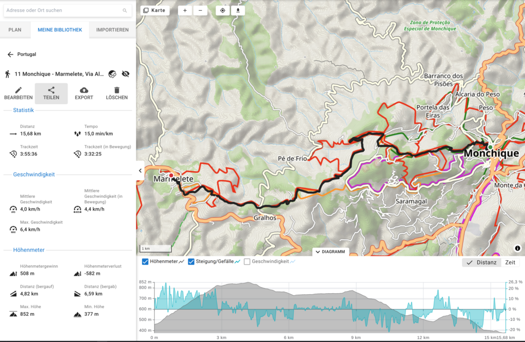 Denn die vierte Etappe hat es dann richtig in sich: 32km, 1473hm hoch, 1016hm runter von Silves nach Monchique. Leider sind die ersten 22km sehr langweilig, viel Straße … dafür die letzten zehn richtig cool. Ich würde mich mit dem Taxi an die Kreuzung EM-1073 Fornalha/Alferce fahren lassen und von da aus direkt in den Berg, hoch zum Picota, reinlaufen. Spart viele sinnlose Kilometer. Aber das letzte Drittel ist wirklich toll, schöner Wald, schöne Aussicht und ein knackiger Anstieg, was will man mehr?